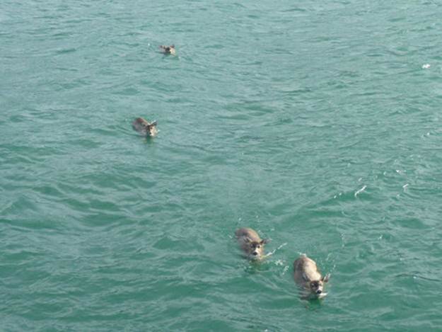 Some fishing stories are a little hard to believe, but this guy has pictures to prove his story... I've heard of salmon jumping into boats, but never anything quite like this... Tom Satre told the Sitka Gazette that he was out with a charter group on his 62-foot fishing vessel when four juvenile black-tailed deer swam directly toward his boat.